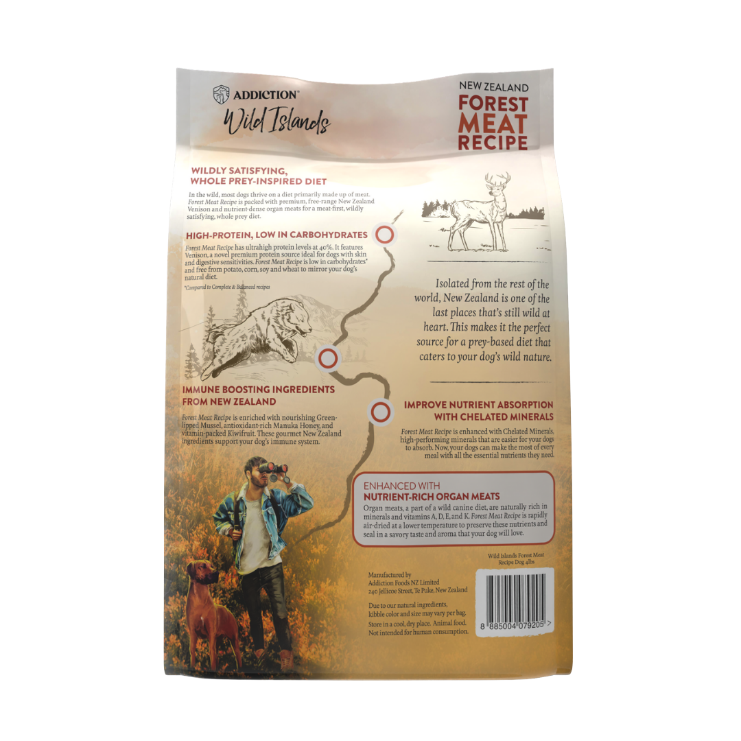 釋放愛犬的原始野性本色—珍島系列森林紅肉犬糧,以犬類原生天性為靈感,打造高蛋白核心配方,蛋白質含量高達40%。配方精選紐西蘭放養鹿肉為首位成分,搭配營養豐富的鹿心、牛肚等內臟,再添加綠唇貽貝、麥盧卡蜂蜜、奇異果等紐西蘭特色食材,提供全面均衡的營養支持,幫助愛犬持久活力與整體健康。產品採用溫和風乾工藝,牢牢鎖住食材天然精華,搭配無穀配方,以純淨天然的美味,全方位守護愛犬健康。